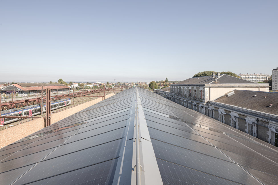Les modules photovoltaïques formant le lanterneau sont en substitution d'une verrière et permettent d'alléger la couverture 10kg/m² soit au moins 16 tonnes de matière économisée.
